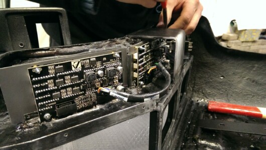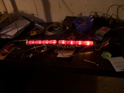 KITTs erster Scanner war noch echte Handarbeit: Die Aluminiumbar wurde von Tim während seiner Mittagspausen aus dem Vollen gefräst, die Elektronik stammte von einem Low-Budget-Lauflicht, das ich mit einfachsten Lötkenntnissen über acht Relais mit Halogenlampen betrieb. Sprich: wenn der Scanner an war, war aus KITTs Motorraum ein permanentes Klicken der Relais zu hören.